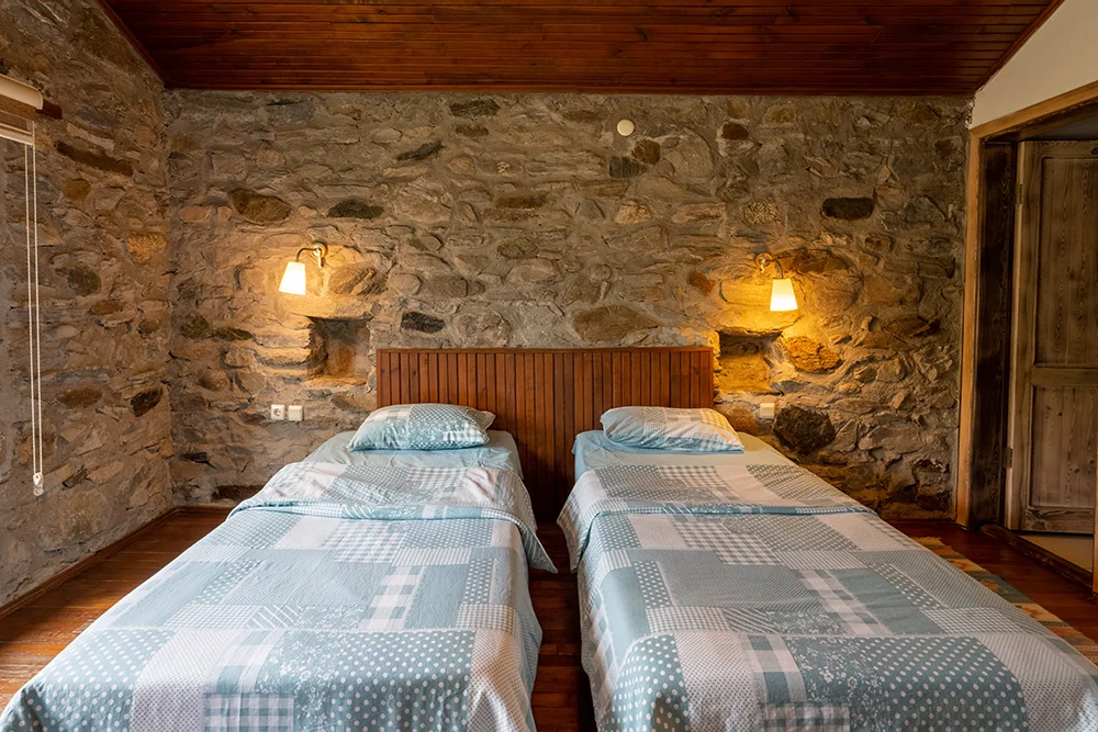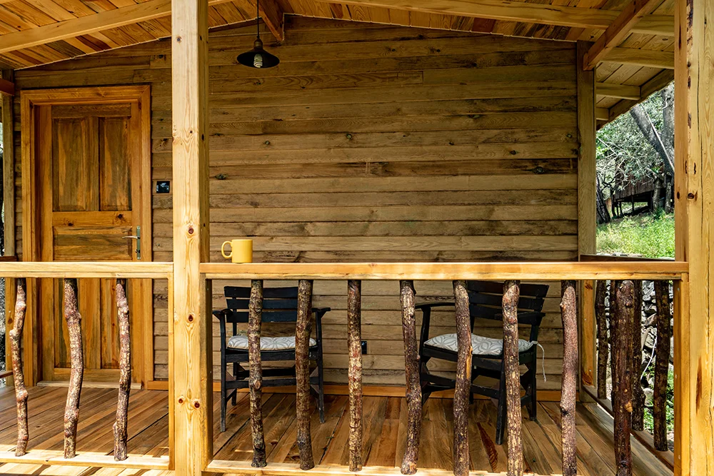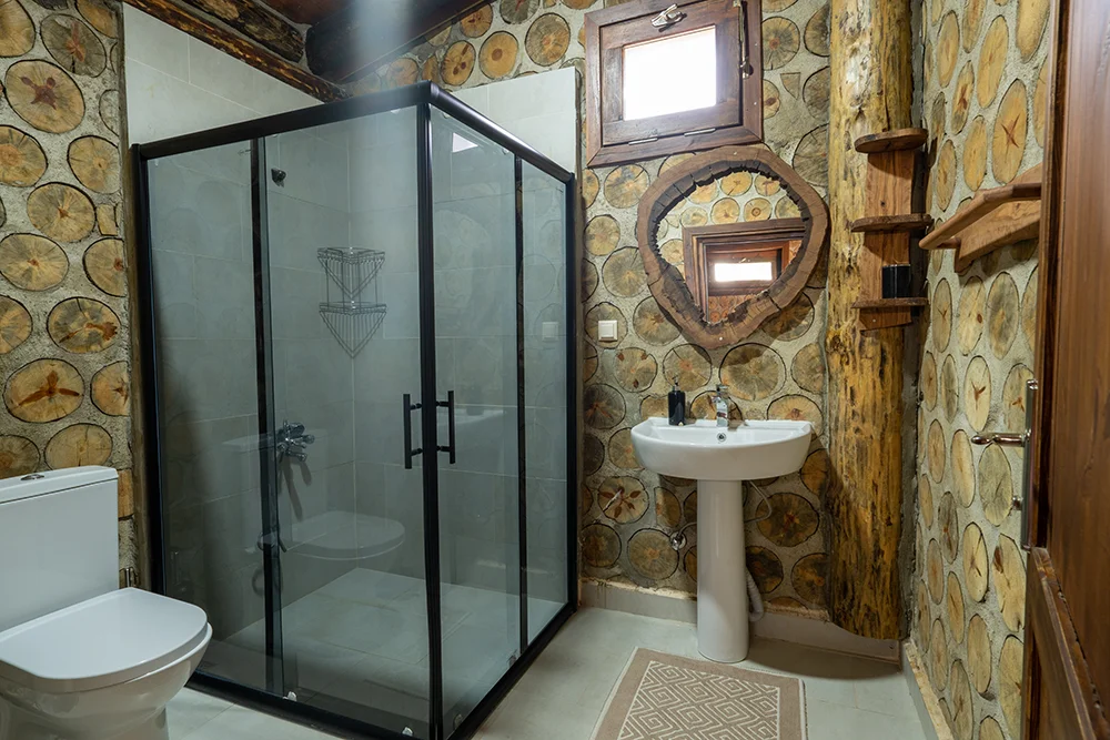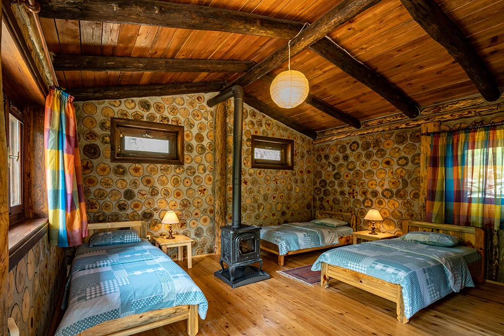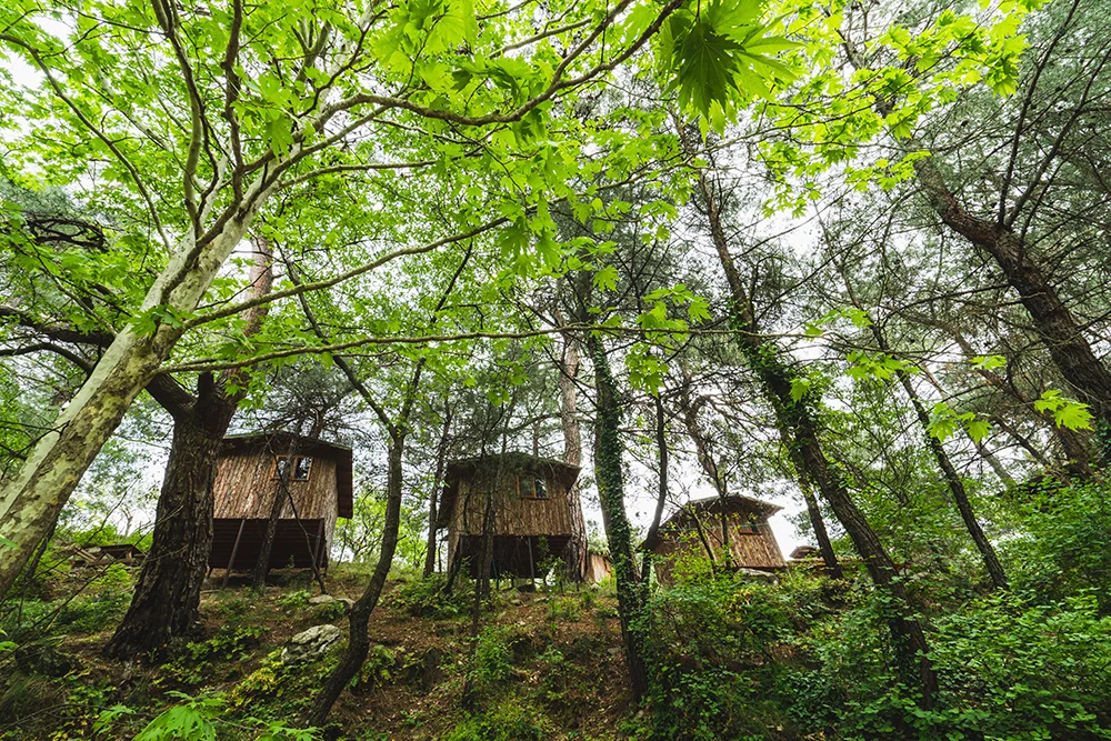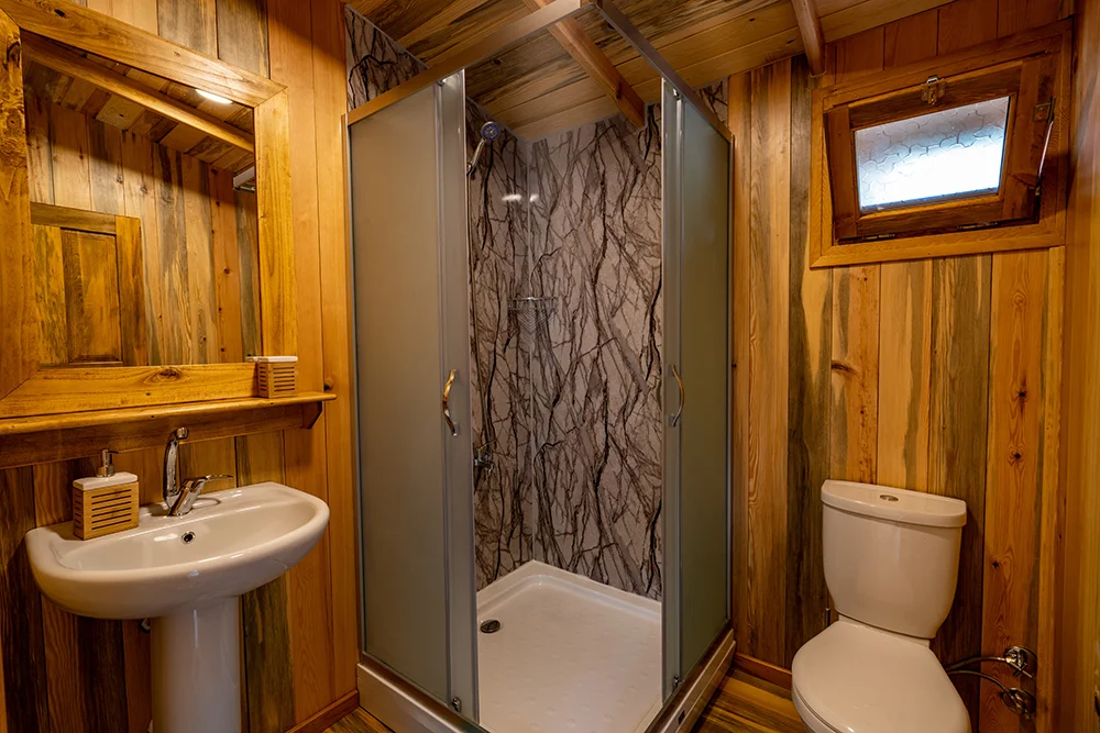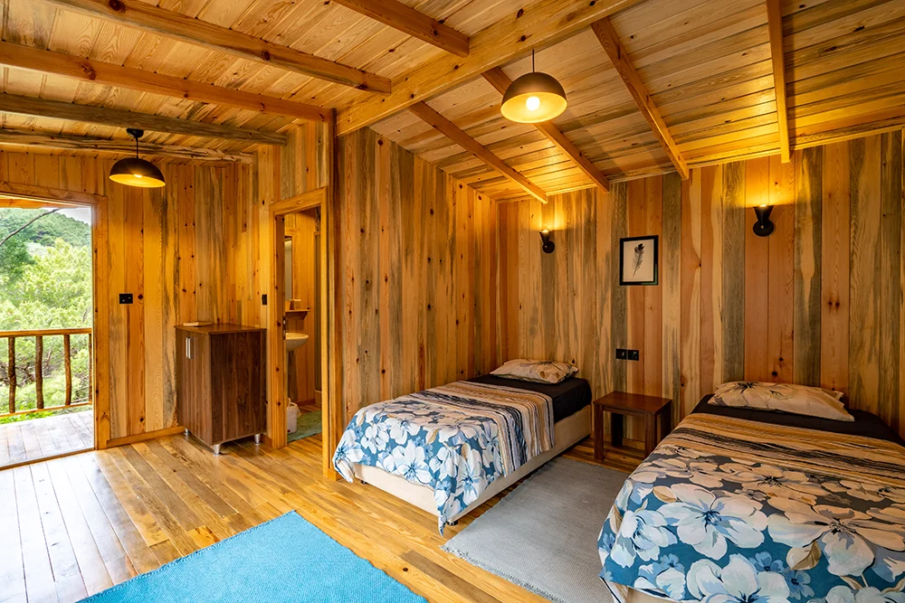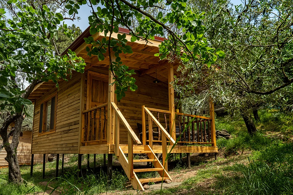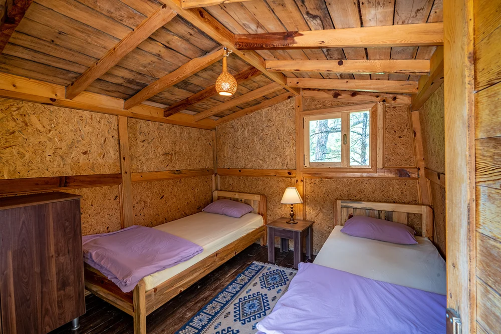 Hem otantik hem de rahat olan duş ve tuvalet paylaşmalı ağaç evlerimiz çoğunlukla 2 kişilik; içerisinde rahat yataklar, dolap, başucu masası ve kabak lambalar var.