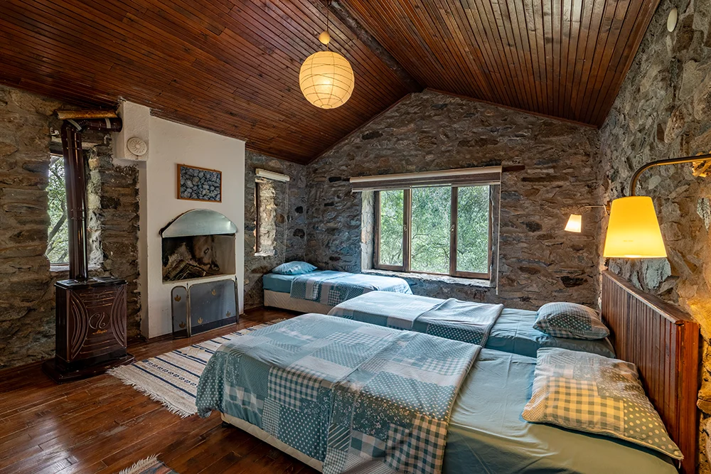 Duş ve tuvaletin ev içinde olduğu 2 veya 3 kişilik ahşap ve taş evler dört mevsim kullanılıyor.